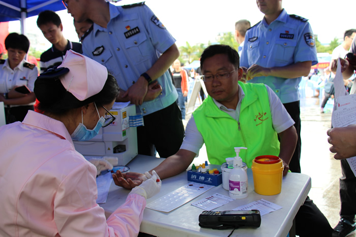 当天,虽然下着雨,但干部职工仍冒着雨一个接一个交上身份证领表。经过体检、血型测定,条件符合的干部职工上车献血。