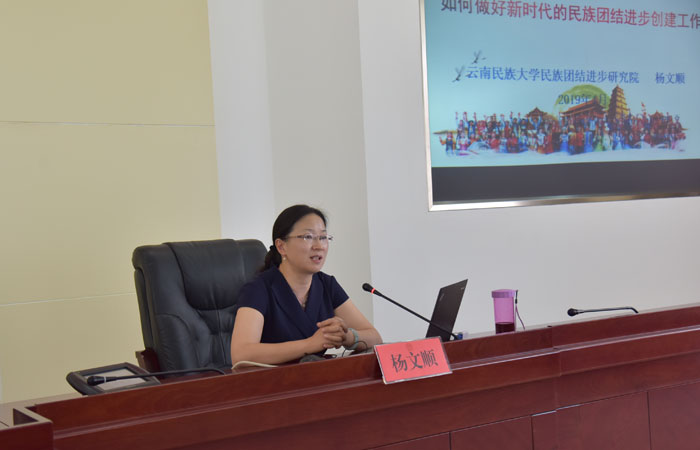 杨文顺博士是云南民族大学民族团结进步研究院执行院长,云南省中青年学术带头人后备人才,国家民委民族团结进步创建高端智库专家,长期从事民族理论与政策、民族关系理论方面的教学和研究。讲座中,她围绕“如何做好新时代的民族团结进步创建工作”这一主题,从民族团结进步创建的科学内涵、发展历程、特点及模式,当前民族团结进步创建工作所面临的困难与挑战,推进新时代民族团结进步创建工作创新发展的几点思考等方面进行了讲授。