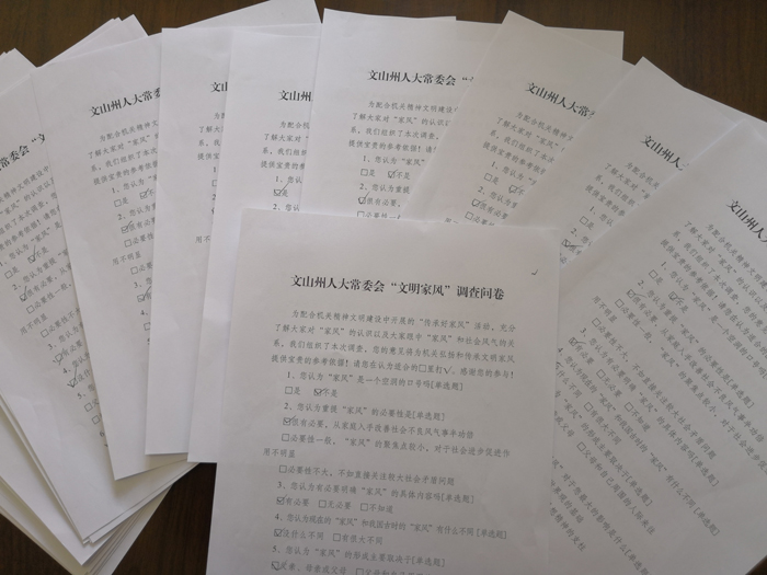 此次问卷调查,也是一次在机关全体干部职工中培育和践行社会主义核心价值观、弘扬家庭传统美德、传承良好家训家风的宣传教育活动,调查活动进一步推进了人大机关家庭文明建设,也引导机关广大党员干部职工为努力推动机关文明家风建立积极贡献自己一份力量。(李洁 文/图)