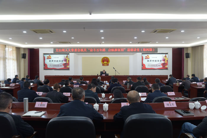 11月11日,文山州人大常委会机关以“奋斗百年路  启航新征程”为主题的2021年第四期道德讲堂开讲。州委党校潘春归老师通过讲唱结合的方式,带领干部职工鉴赏红色经典音乐作品,学习歌曲背后的党史故事,重温峥嵘岁月。