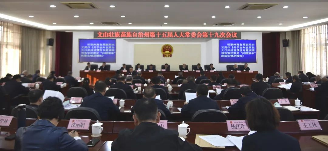 上午8点30分,州十五届人大常委会第十九次会议第一次全体会议举行。会议通过了州十五届人大常委会第十九次会议议程(草案)。听取了《州人民政府关于全州发展壮大口岸经济情况专题调研报告审议意见“问题清单”落实情况的报告》及州人大常委会监督报告。听取了《州人民政府关于推进全州教育高质量发展工作审议意见“问题清单”落实情况的报告》及州人大常委会监督报告。听取了《州人民政府关于对全州乡村振兴工作审议意见“问题清单”落实情况的报告》及州人大常委会监督报告。听取了《州工业和信息化局关于文山州工业和信息化工作审议意见“问题清单”落实情况的报告》及州人大常委会监督报告。听取了《州人民政府关于2022年度全州行政执法工作审议意见“问题清单”落实情况的报告》及州人大常委会监督报告。听取了《州公安局关于全州公安机关整治酒驾醉驾工作审议意见“问题清单”落实情况的报告》及州人大常委会监督报告。